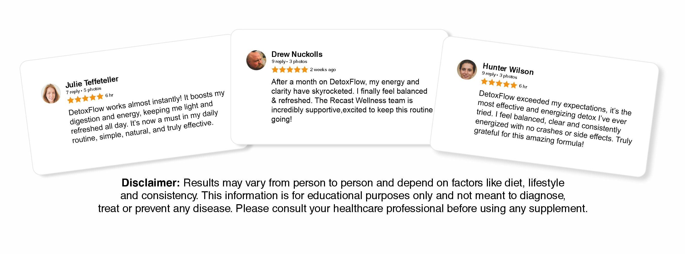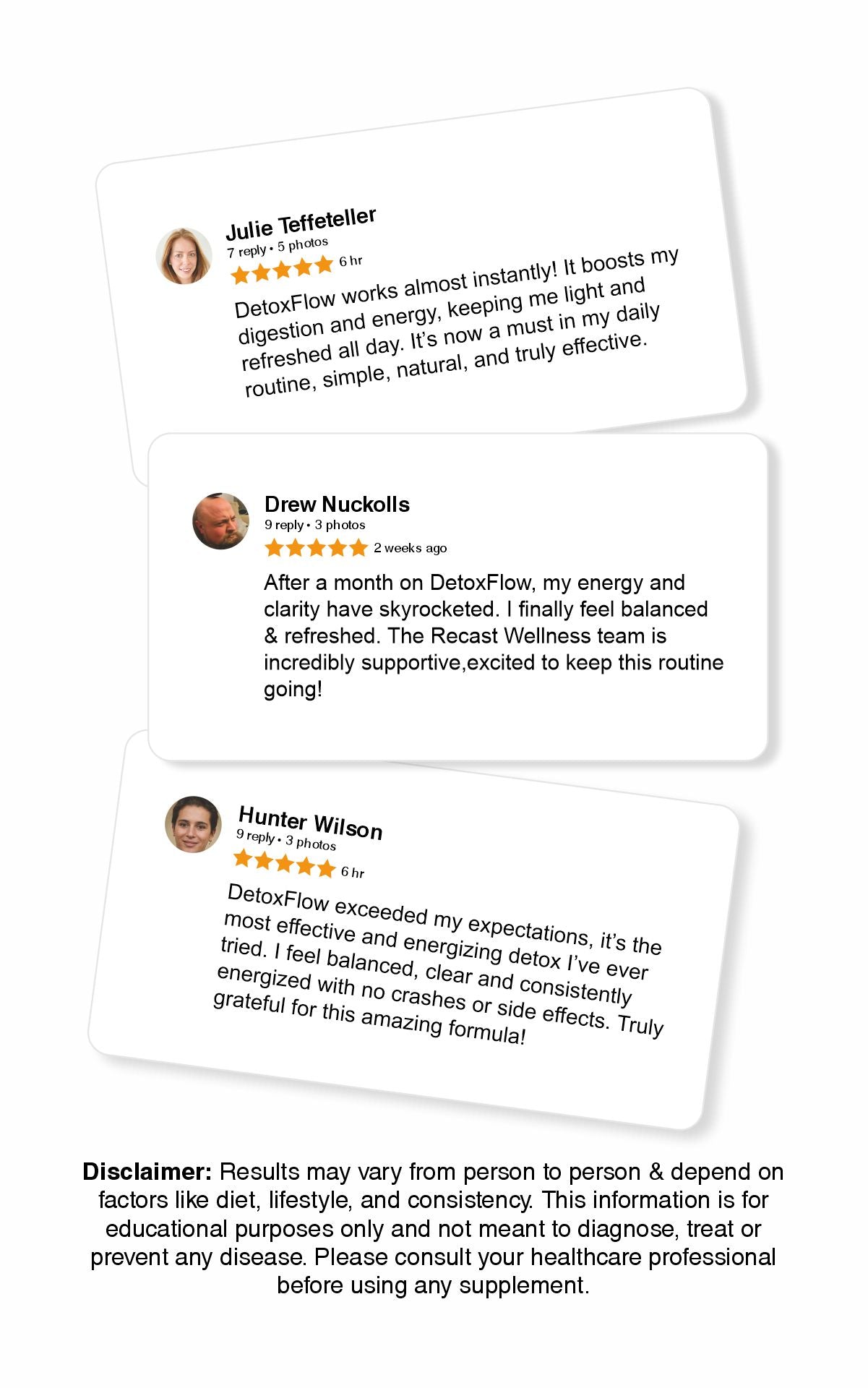 Unlike ordinary detox supplements, Recast DetoxFlow combines probiotics, acai berry, and green tea to naturally cleanse your system, support digestion, and boost metabolism — all without harsh laxatives or chemical additives.