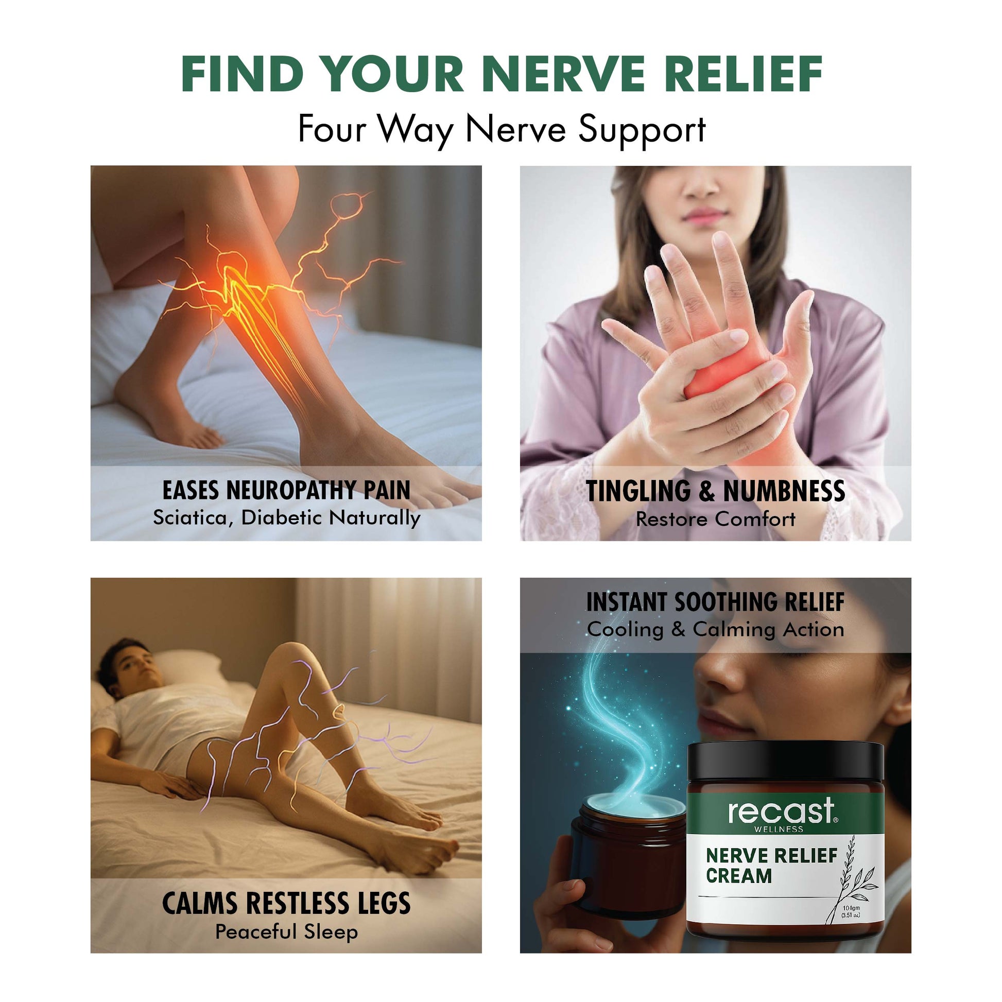 Unlike ordinary pain relief creams, Recast Nerve Relief Cream is crafted with a potent blend of Magnesium, Arnica, MSM and soothing botanicals that penetrate deeply to calm nerves, ease tingling, and reduce discomfort. Its fast-absorbing, non-greasy formula provides lasting relief without harsh chemicals, overpowering odors, or skin irritation.