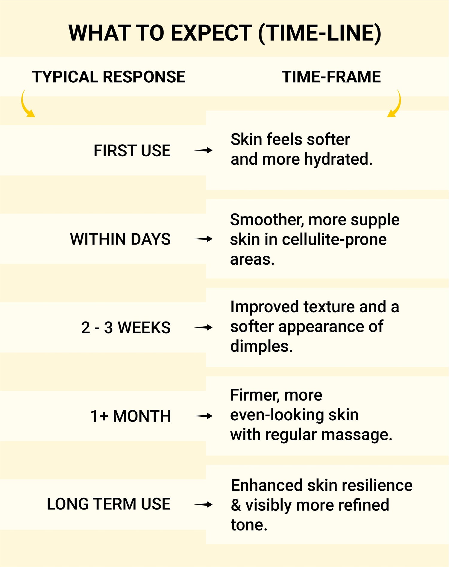 Most customers notice their skin feeling smoother and more hydrated within the first week. Visible improvements in firmness and reduced dimpling generally appear with consistent daily use over 3–6 weeks.